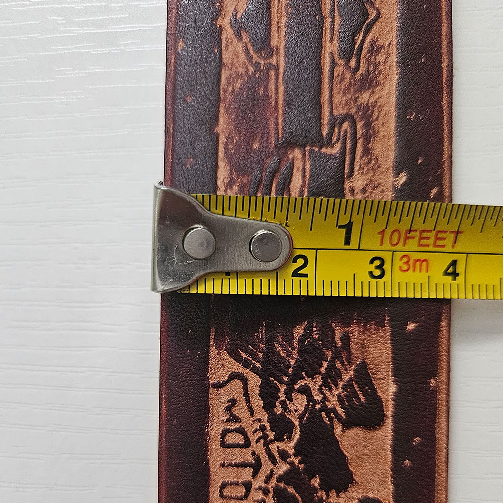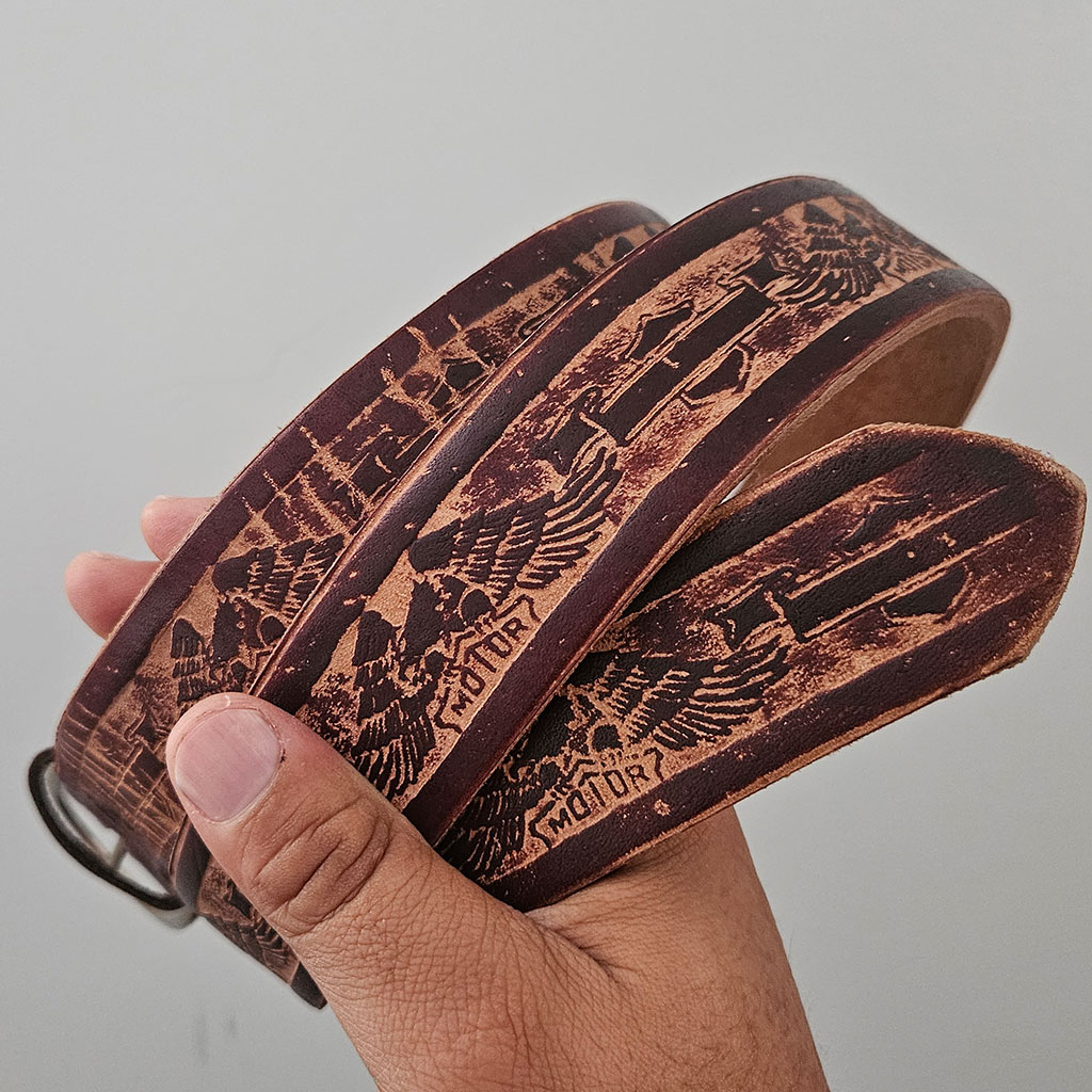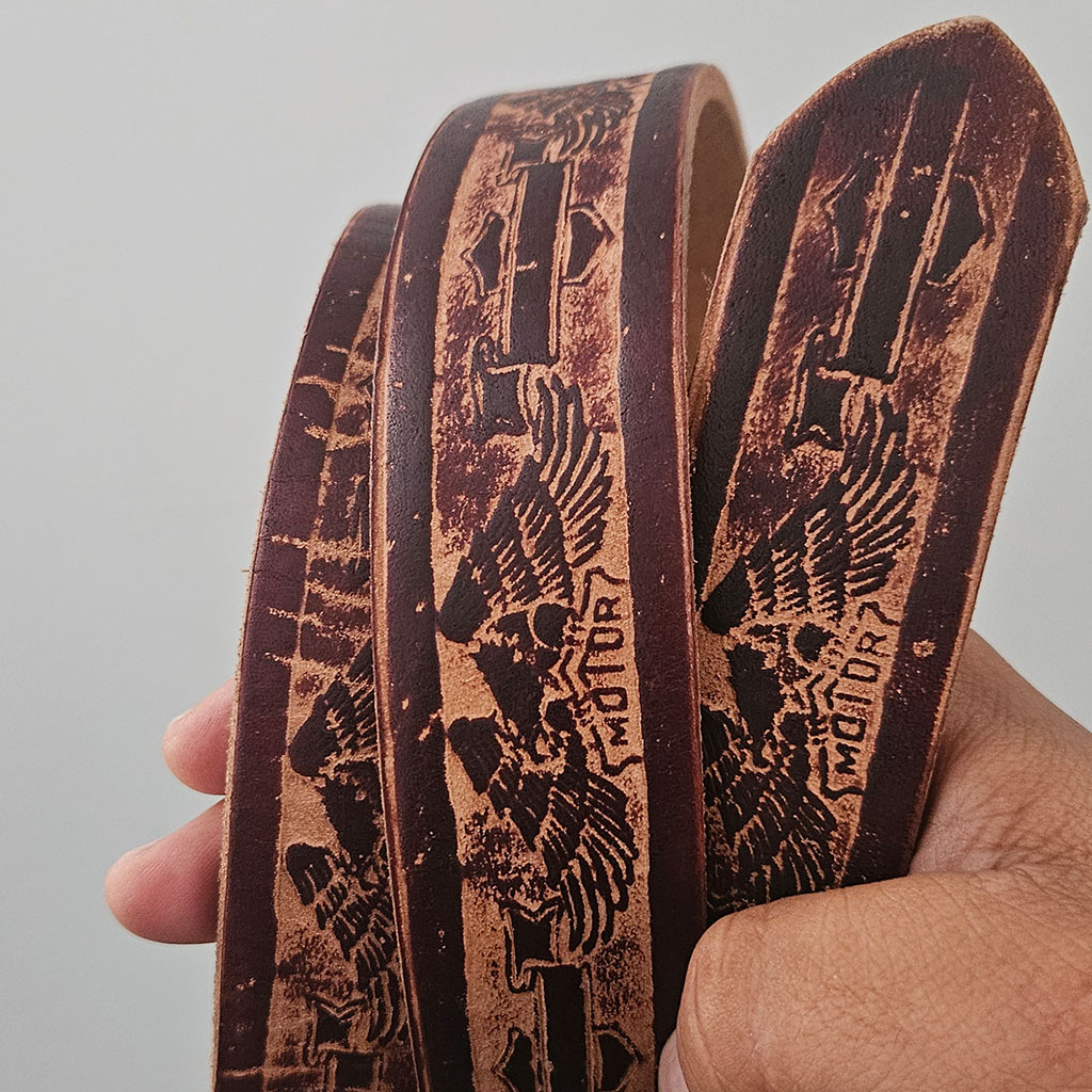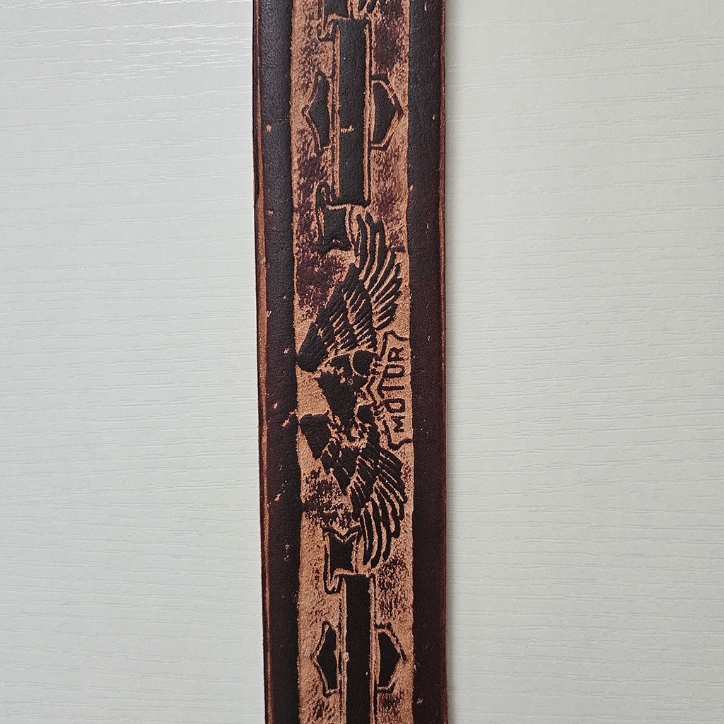 We brought a few leather belts from Guyana. These are from real leather and very strong. A quality product from “back home”. Jürgen bought a few for himself and uses them every day. They are long (about 51 inches), so you can cut them to size (if needed). This one has a “motor” motif printed on brown colored leather that looks very much like “that” American motorcycle brand.