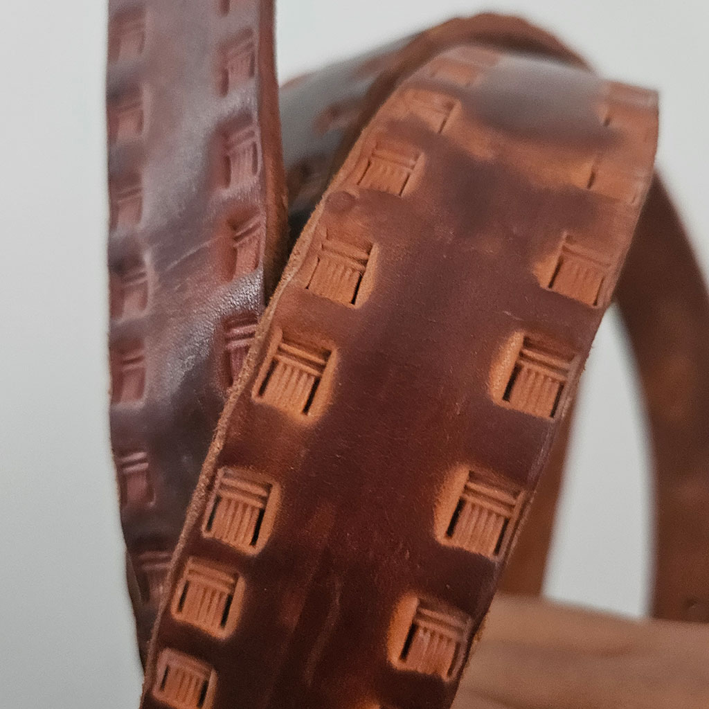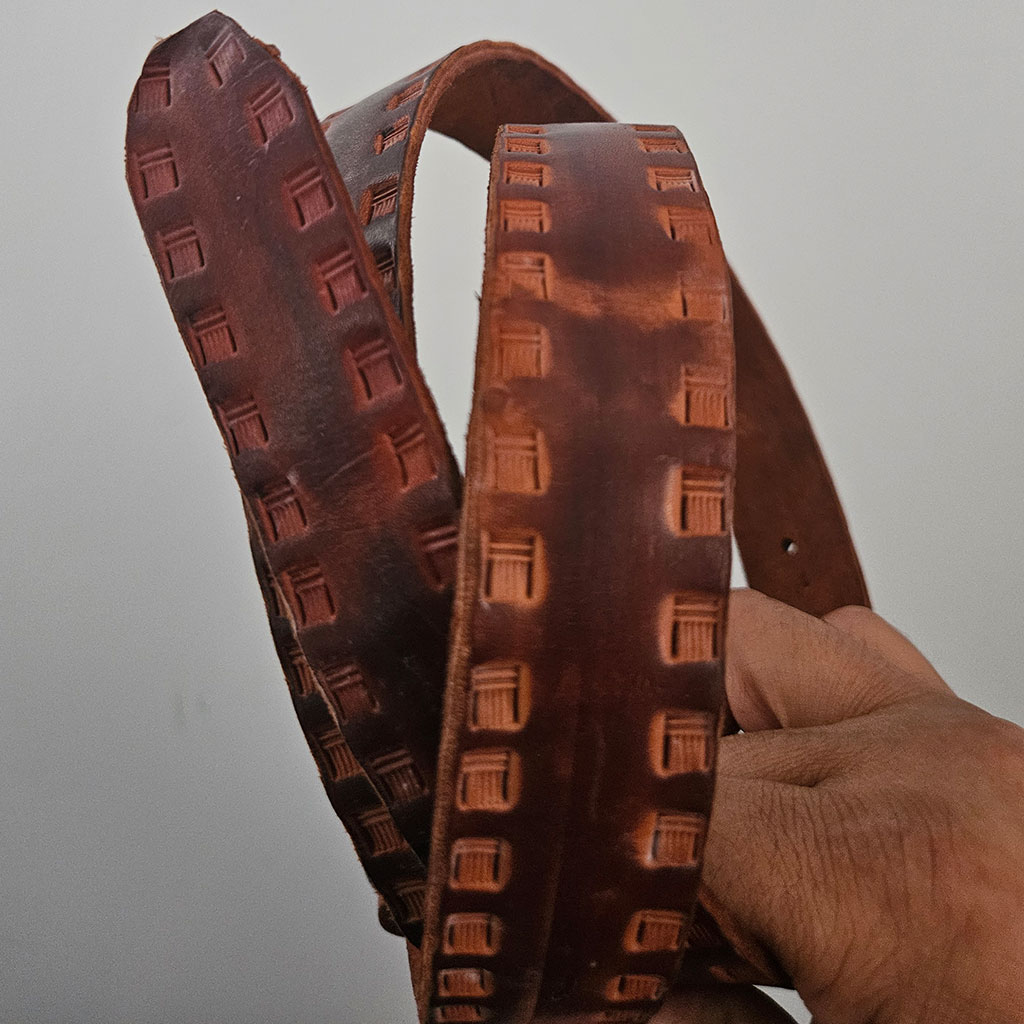 We brought a few leather belts from Guyana. These are from real leather and very strong. A quality product from “back home”. Jürgen bought a few for himself and uses them every day. They are long (about 51 inches), so you can cut them to size (if needed). This one has a “square” motif printed on brown colored leather.